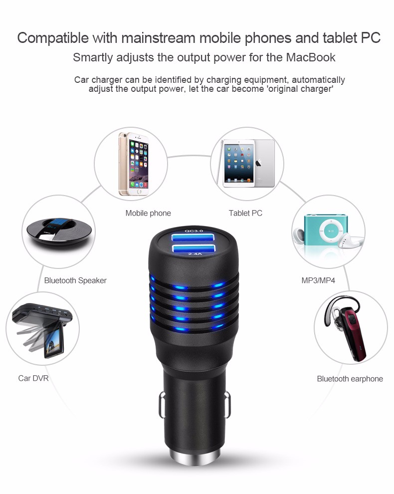 LED Light 2 USB Port Durable Car Charger with QC 3.0 Quick Charge For All Of Mobile Phone