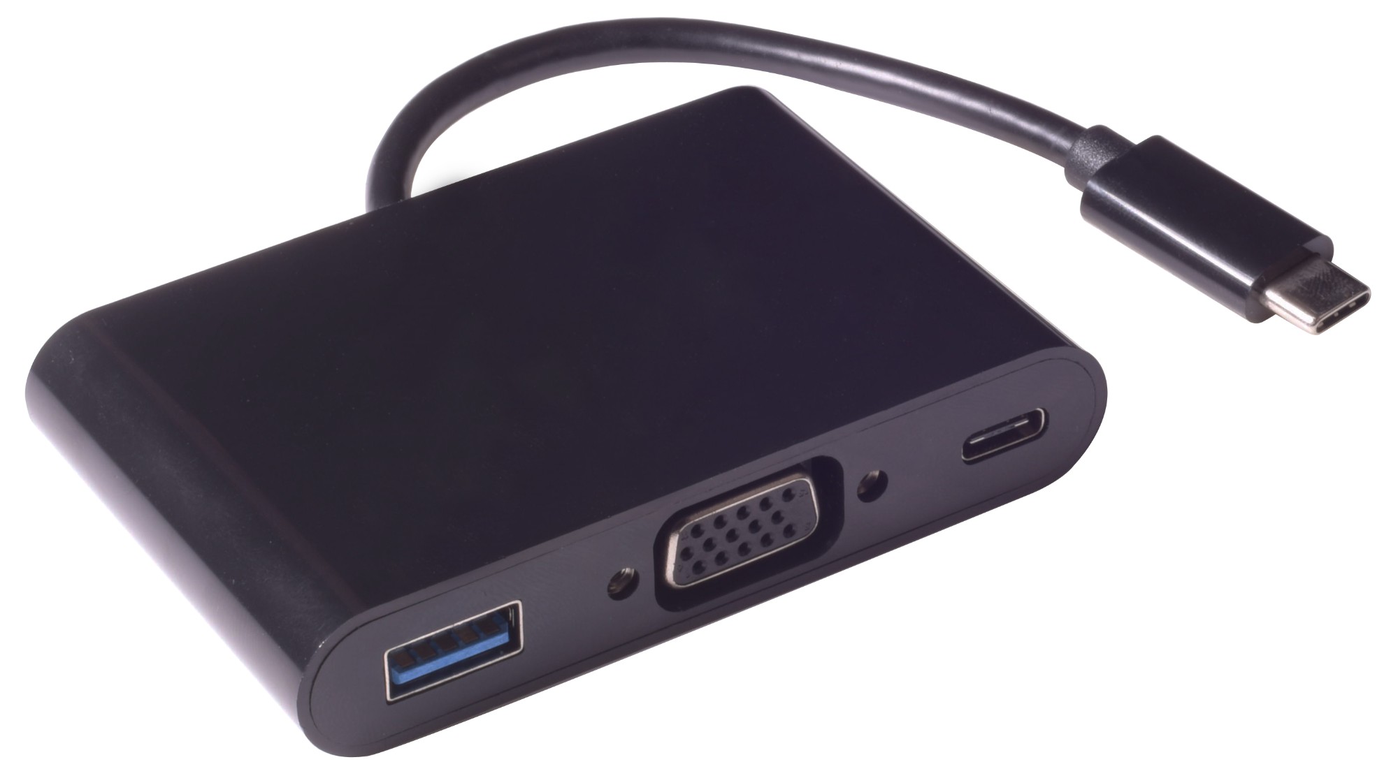 3-IN-1 Type USB-C Male to USB 3.0 VGA Type C Female Charger Adapter Cable*Side 1(Input): USB 3.1 Type C Male*Side 2-1(Output): Type C Female*Side 2-2(Output): VGA Female*Side 2-3(Output): USB 3.0