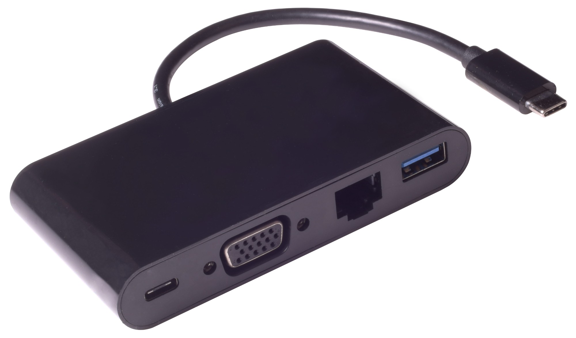 This is a USB 3.1 Type C to USB 3.0 Port with Gigabit Ethernet port, VGA port and Type C charging port hub,