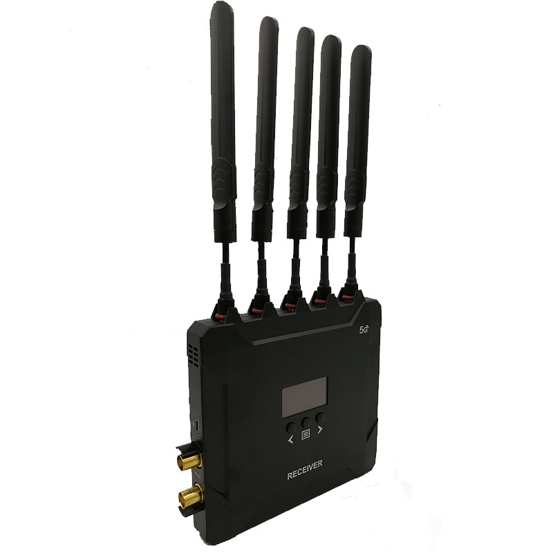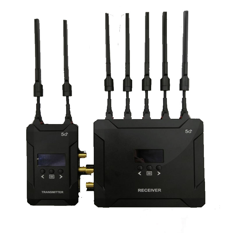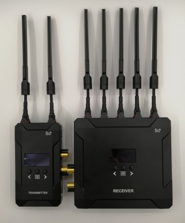 This products include a transmitter and a receiver, and is equipped with 3G/HD SDI interface and full HD HDMI interface. The transmitter has two antennas and the Receiver has five antennas. The antennas’ operate frequency is 5.1GHz~5.9GHz, and these frequency is changeable through the software configuration to adopt the wireless regulatory requirements in the world. And the same time, these machines have been fitted with OLED screen for display the wireless signal, channel numbers, Resolutions, Frame Rate and 3 buttons for switching the channel by manual. There have 10 channels (from zero to nine).
